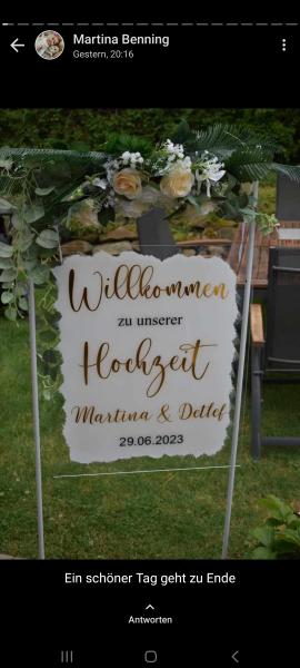 Das Schild ist Bestandteil der Vermietung, gibt es in verschiedenen Farben : weißer Hintergrund mit Schriftzüge in schwarz, gold roségold oder Kupfer.